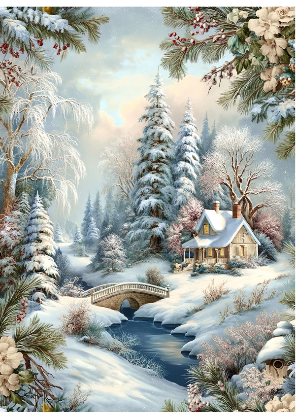 Papier ryżowy A4 do decoupage Artando -widok, pejzaż zimowy, domy, zima