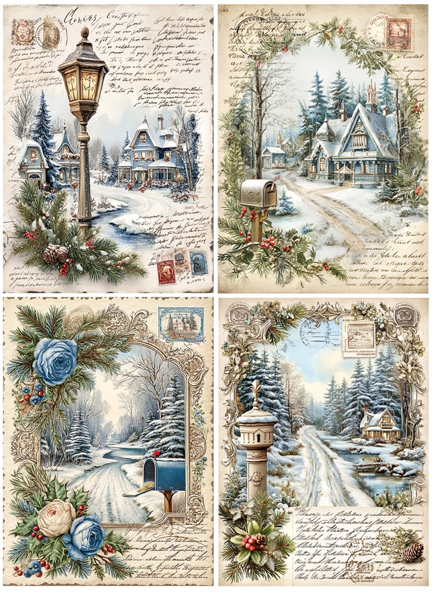 Papier ryżowy A4 do decoupage Artando -widok, pejzaż zimowy, domy, zima