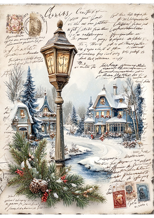 Papier ryżowy A4 do decoupage Artando -widok, pejzaż zimowy, domy, zima
