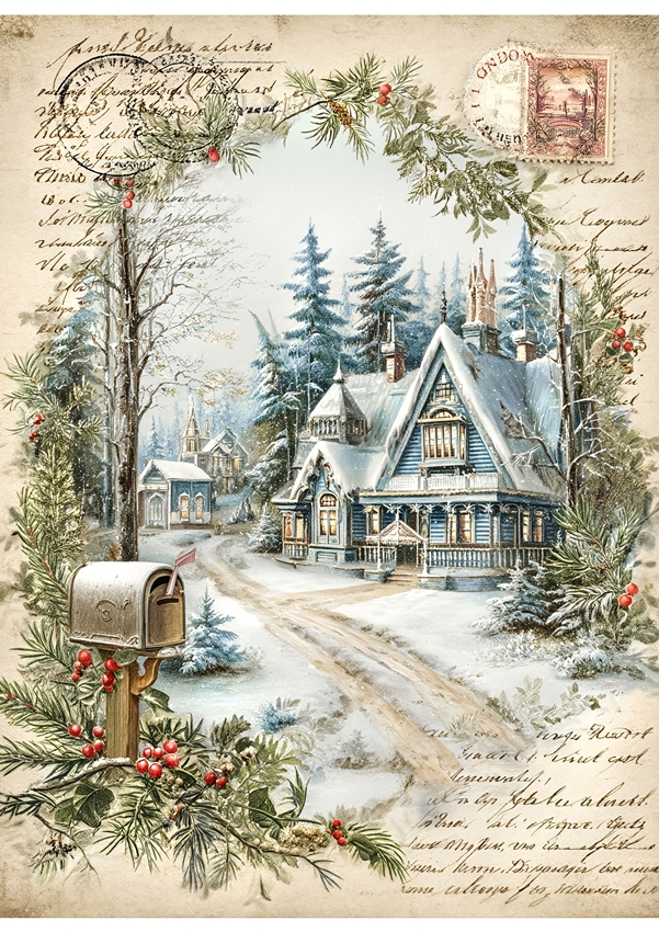 Papier ryżowy A4 do decoupage Artando -widok, pejzaż zimowy, domy, zima