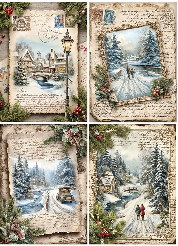Papier ryżowy A4 do decoupage Artando -widok, pejzaż zimowy, domy, zima