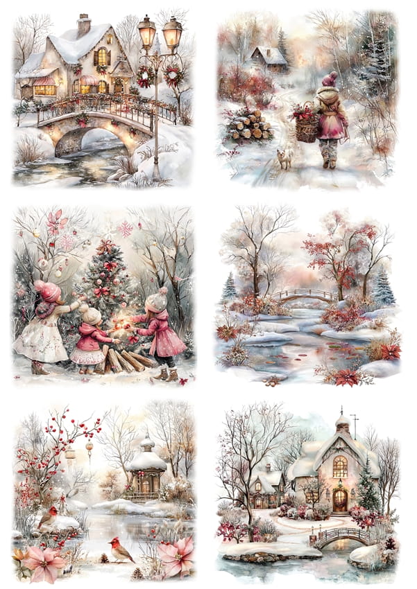 Papier ryżowy A4 do decoupage Artando - widok, pejzaż zimowy, dzieci, kościoły