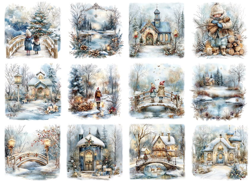 Papier ryżowy A4 do decoupage Artando - widok, pejzaż zimowy, dzieci, kościoły