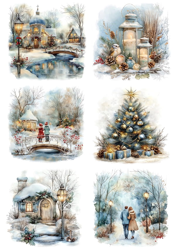Papier ryżowy A4 do decoupage Artando - widok, pejzaż zimowy, dzieci, kościoły