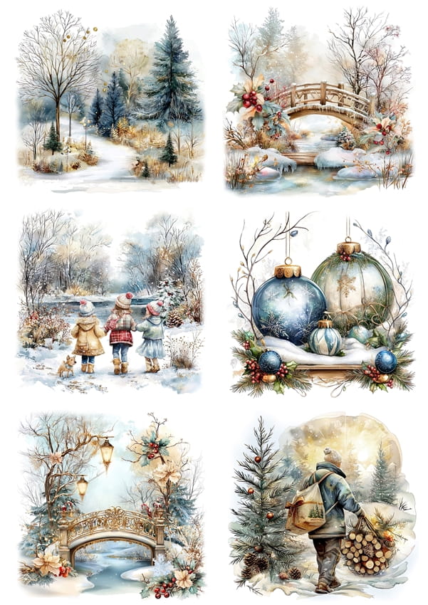 Papier ryżowy A4 do decoupage Artando - widok, pejzaż zimowy, dzieci, kościoły