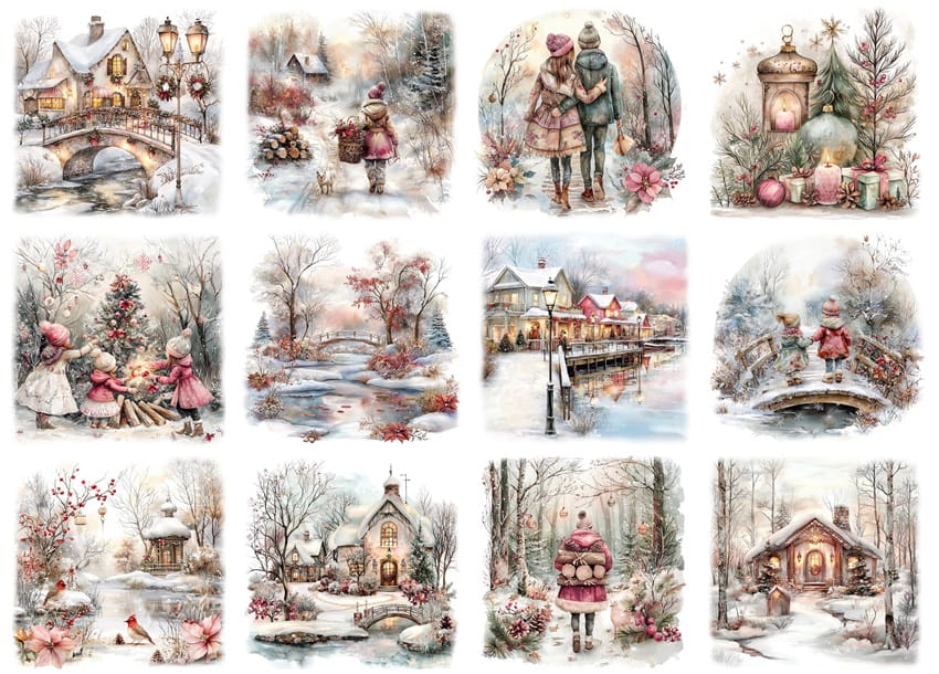 Papier ryżowy A4 do decoupage Artando - widok, pejzaż zimowy, dzieci, kościoły