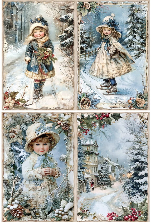 Papier ryżowy A4 do decoupage Artando - widok, pejzaż zimowy, dzieci, miasteczko