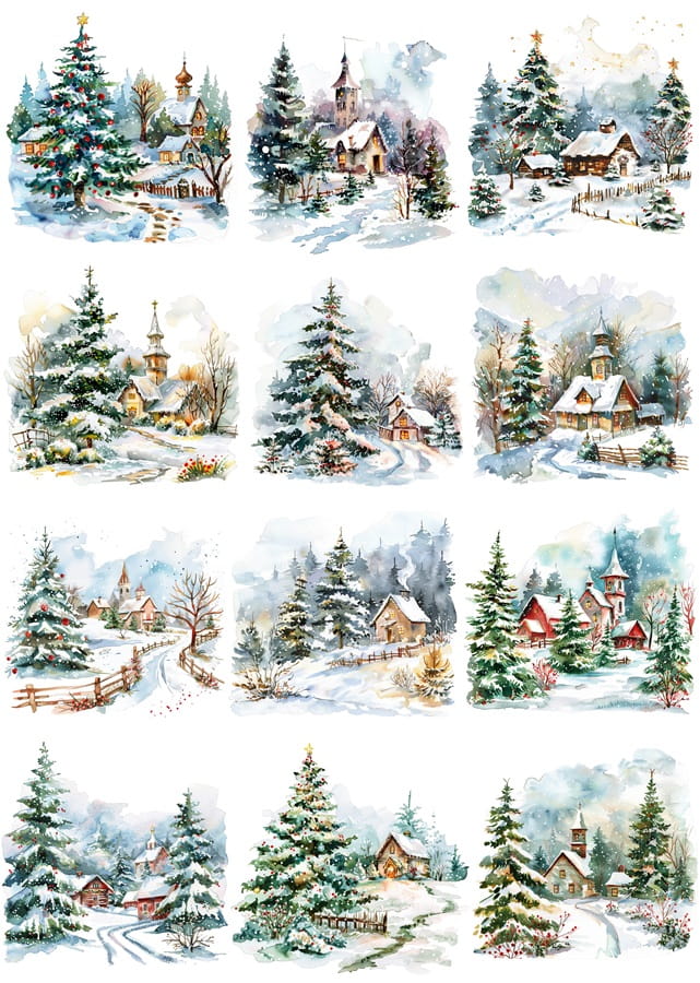 Papier ryżowy A4 do decoupage Artando - widok, pejzaż zimowy, kościółki, zima