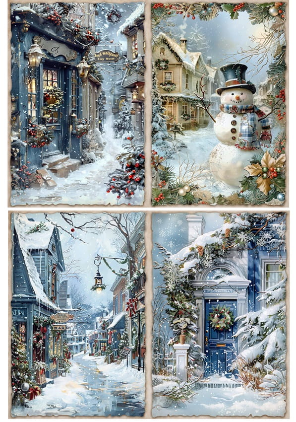 Papier ryżowy A4 do decoupage Artando - widok, pejzaż zimowy, miasteczko, bałwan