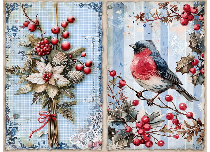 Papier ryżowy A4 do decoupage Artando - widok, pejzaż zimowy, ptak, ostrokrzew