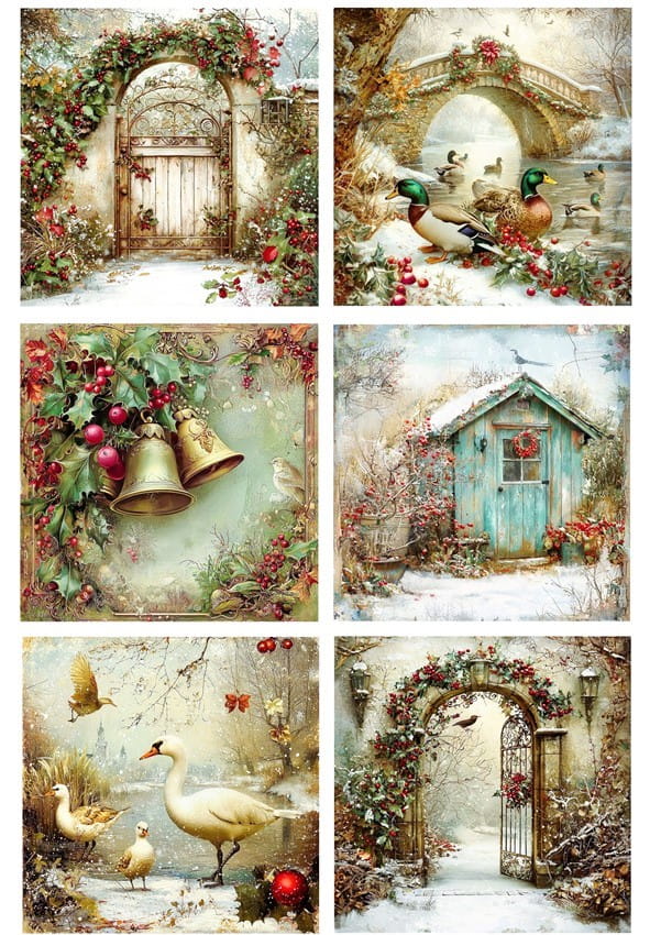 Papier ryżowy A4 do decoupage Artando - widok, pejzaż zimowy, ptaki, ostrokrzew, kwiaty