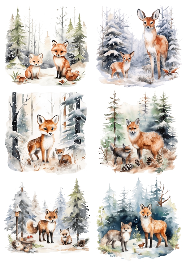 Papier ryżowy A4 do decoupage Artando - widok, pejzaż zimowy, zwierzęta, lisy, sarny, zima