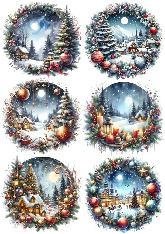 Papier ryżowy A4 do decoupage Artando - widok zimowy, pejzaż, zima, domki, wianek, bombki, świece