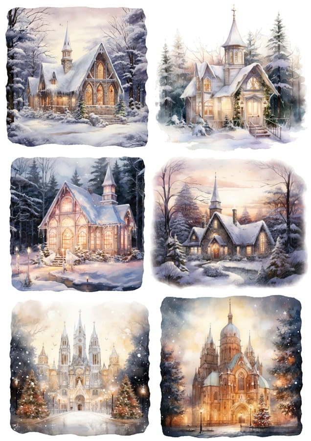 Papier ryżowy A4 do decoupage Artando - widok zimowy, pejzaż, zima, kościoły, katedry