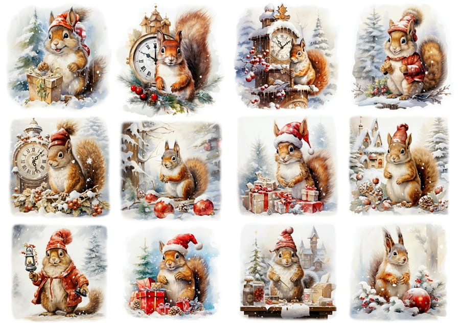 Papier ryżowy A4 do decoupage Artando - wiewiórki, zegary, zima, święta