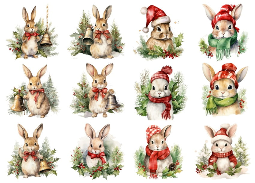 Papier ryżowy A4 do decoupage Artando - zające, dzwonki, ostrokrzew, zima