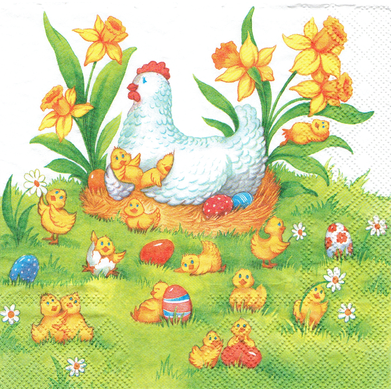 Serwetka decoupage 33x33 cm - Wielkanoc, kura, kurczaki, kwiaty