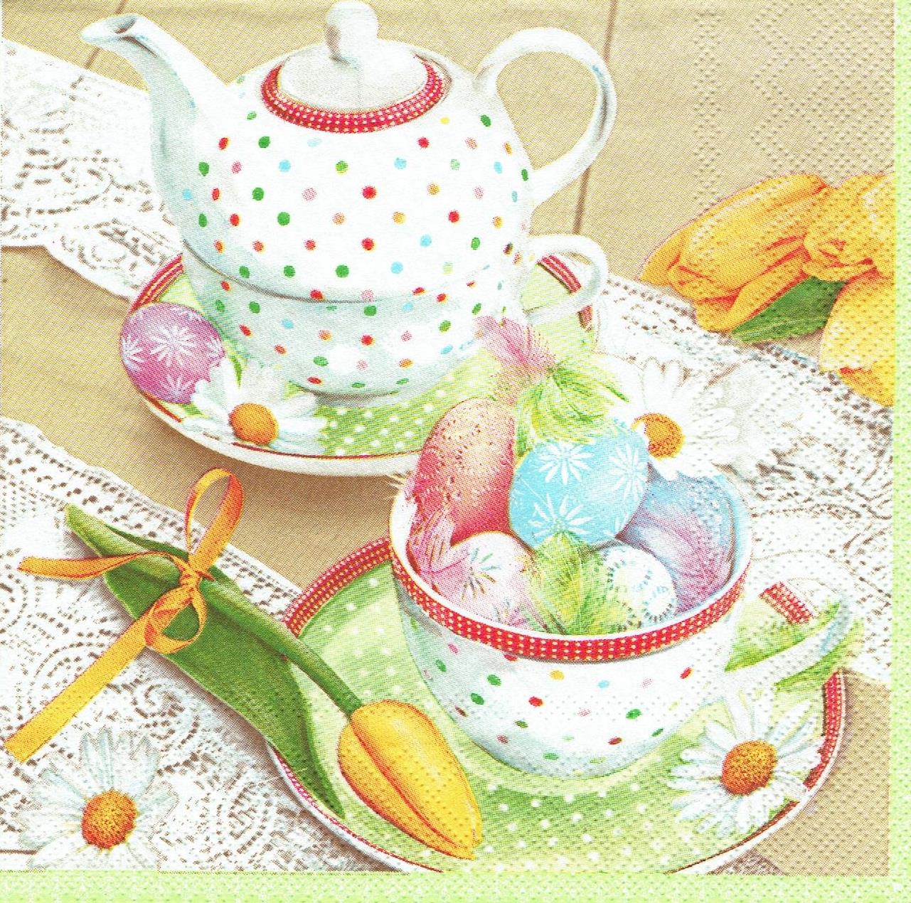 Serwetka decoupage 33x33 cm - Wielkanoc, pisanki, filiżanka, kwiaty