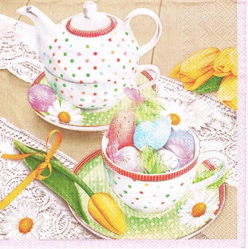 Serwetka decoupage 33x33 cm - filiżanka, imbryk, pisanki, tulipany