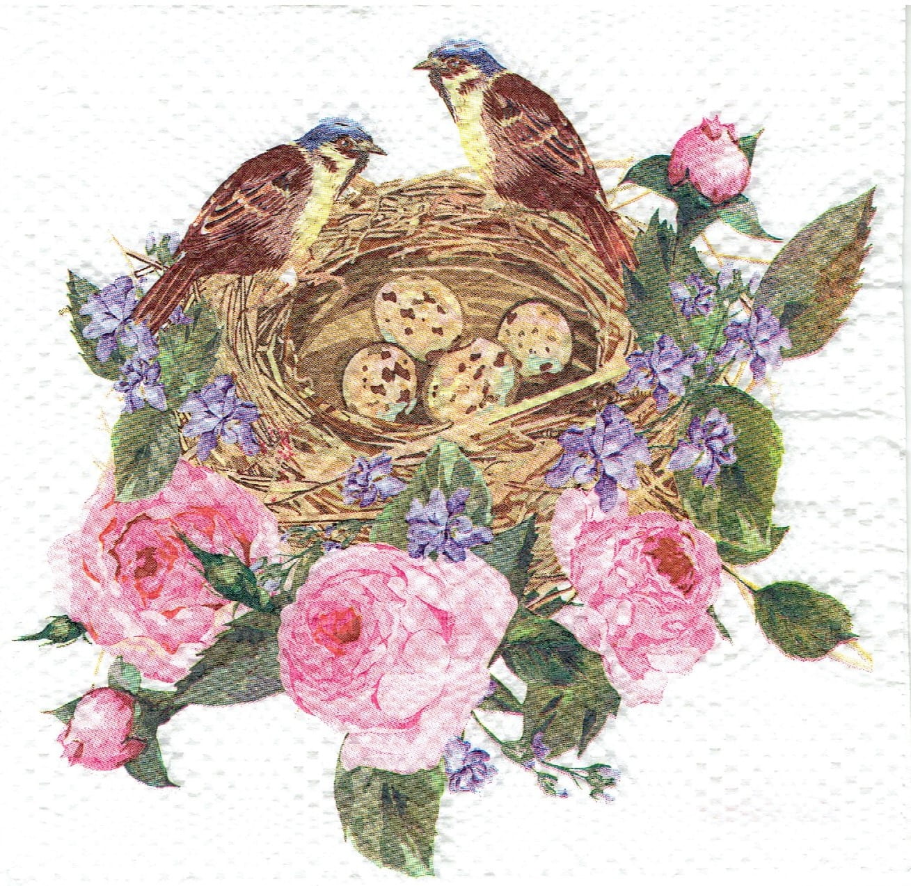 Serwetka decoupage 33x33 cm - gniazdko, ptaki, kwiaty, róże