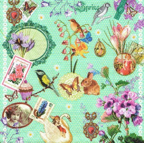 Serwetka decoupage 33x33 cm - kwiaty, ptaki, motyle, znaczki