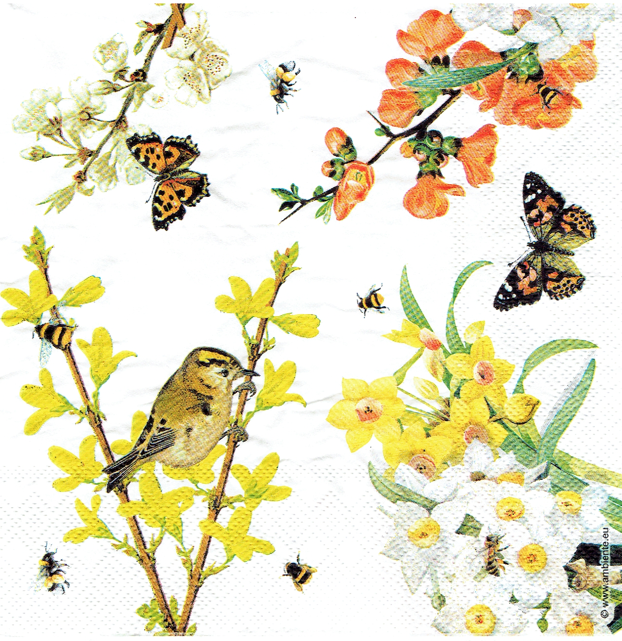 Serwetka decoupage 33x33 cm - kwiaty wiosenne, narcyzy, ptak, motyle