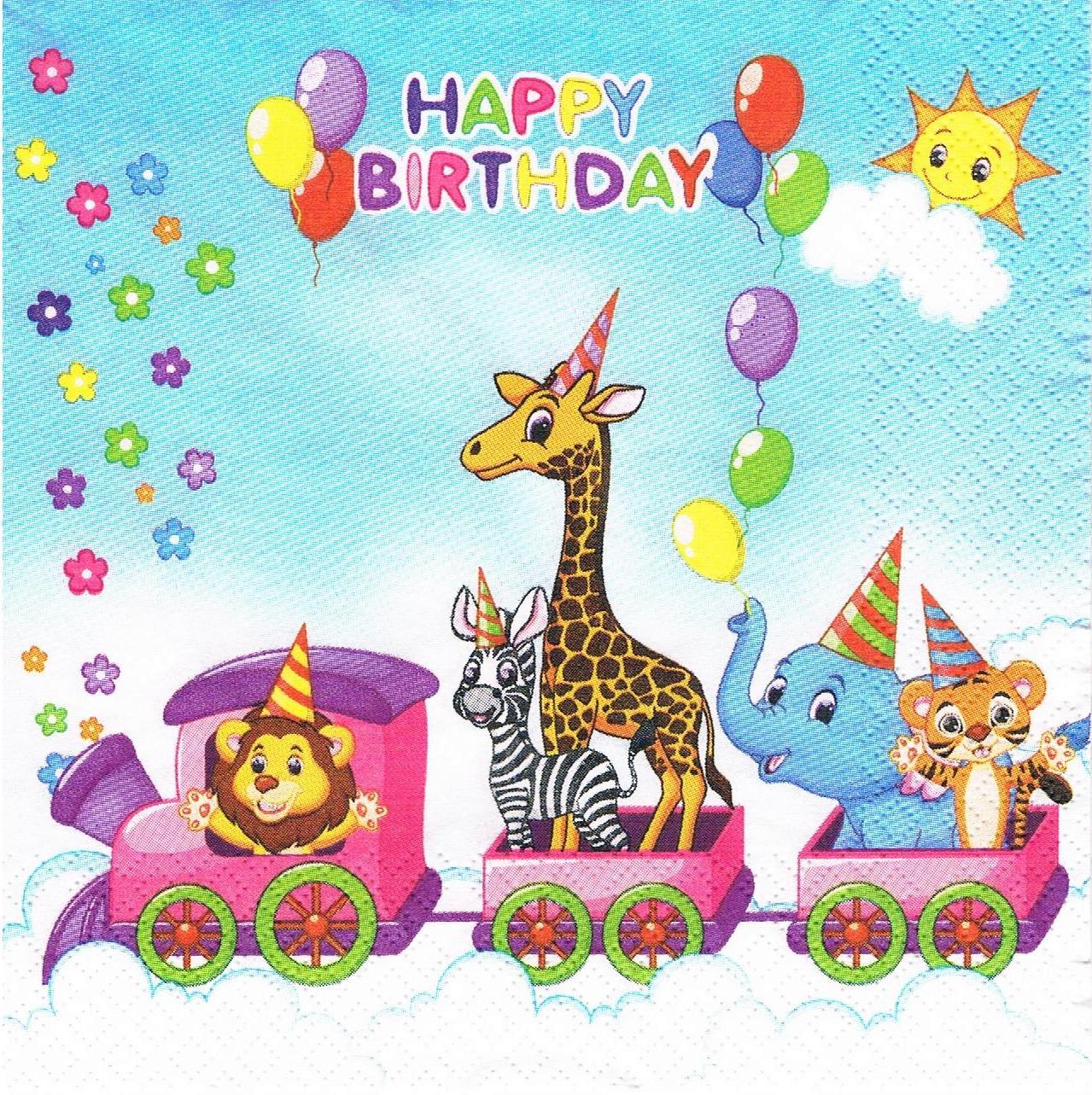 Serwetka decoupage 33x33 cm - lokomotywa ze zwierzętami, balony, urodziny