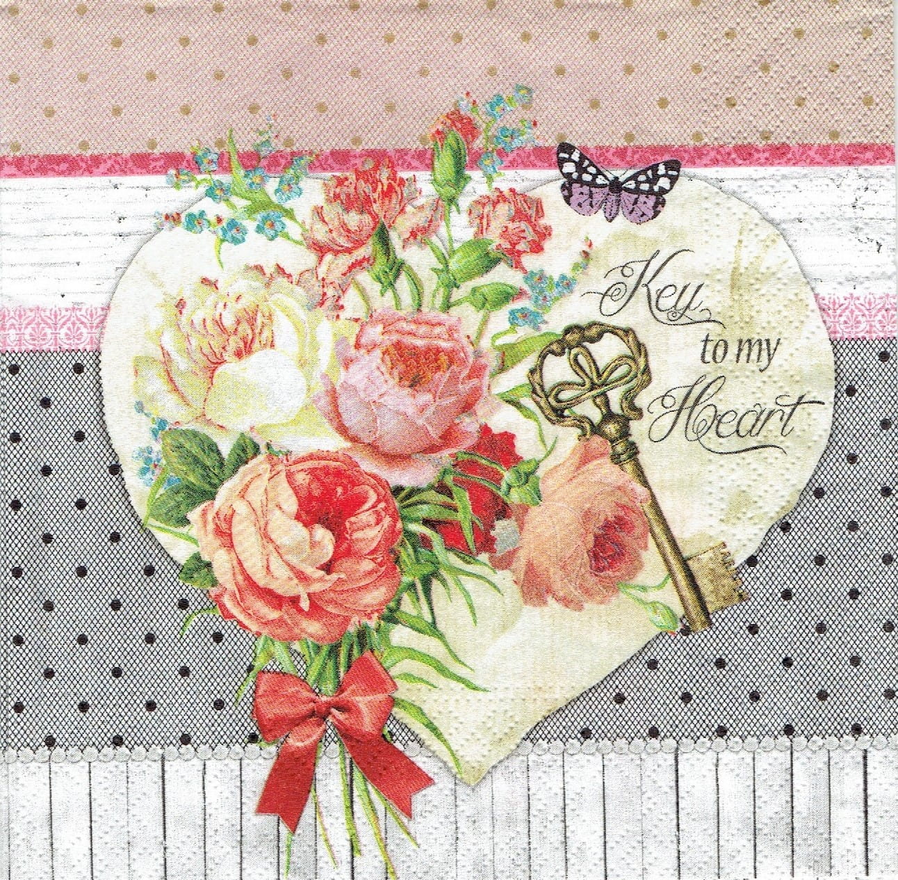 Serwetka decoupage 33x33 cm - serce, róże, klucz