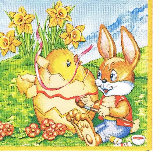 Serwetka decoupage 33x33 cm - zając, pisanka, kurczak, narcyze, łąka