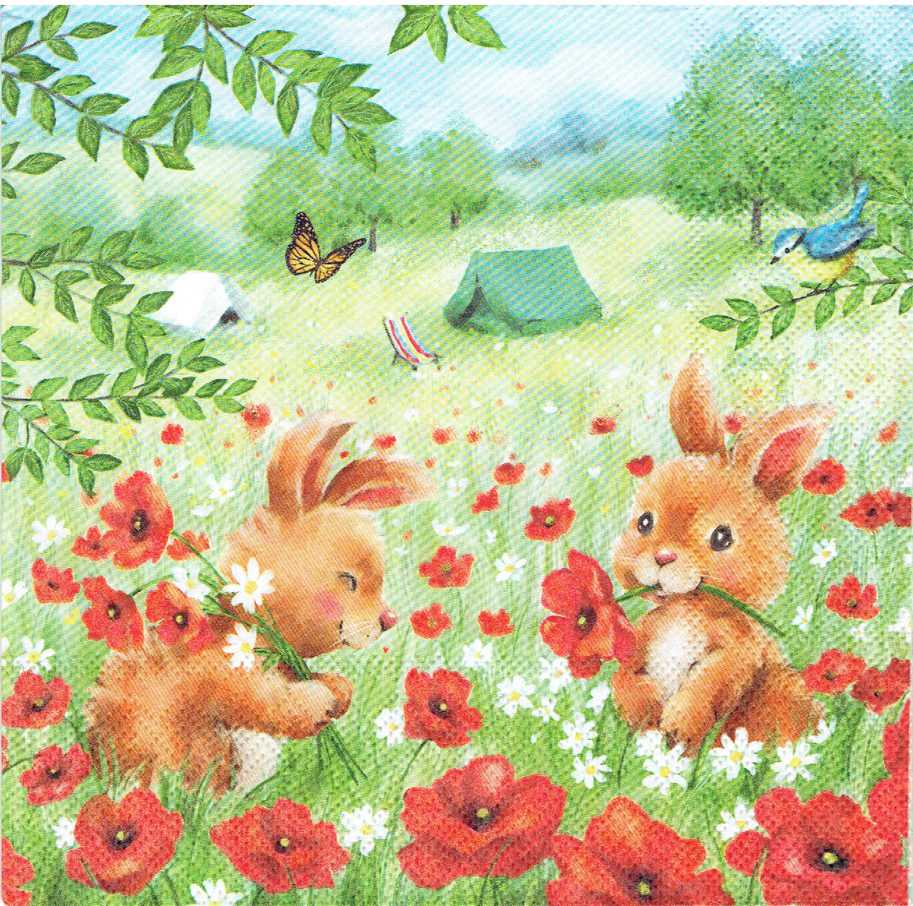 Serwetka decoupage 33x33 cm - zające, zajączki, biwak, kwiaty, maki
