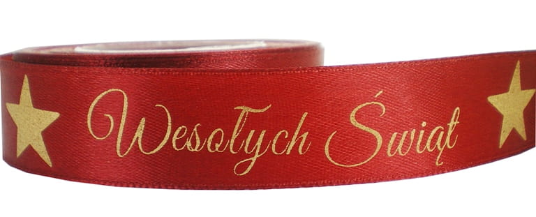 Wstążka atłasowa bordowa z napisem Wesołych Świąt.