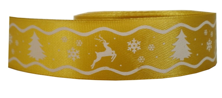Wstążka atłasowa złota z motywem świątecznym: renifery, choinki, śnieżynki.