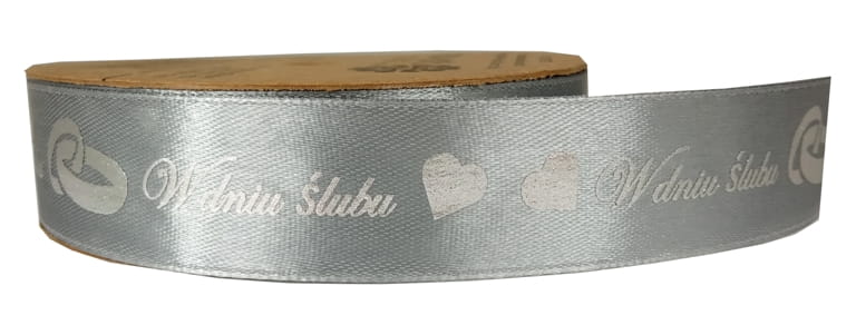Tasiemka satynowa "W Dniu Ślubu" srebrna 25mm 3,5 m